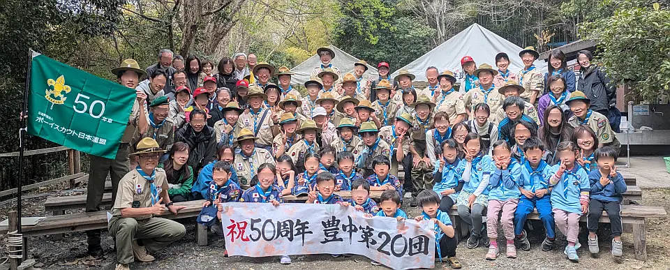 豊中第20団は、1975年に豊中14団から指導者9名とスカウト27名が分かれて誕生しました。翌1976年2月1日に正式に連盟に登録され、カブ隊とボーイスカウト隊が発足、その後もベンチャー隊やローバー隊が誕生し、1993年にはビーバー隊も加わりました。
