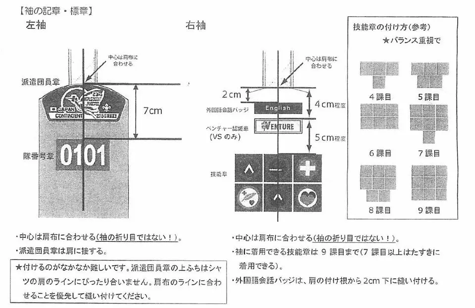 技能章は、各々0.5cm離してつける。中心は、肩布にあわせること(袖の折り目ではない!)