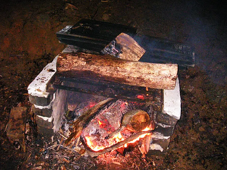 ナタで木材を削って火をつけて。こうして、勢いのあるかまどの火ができます。