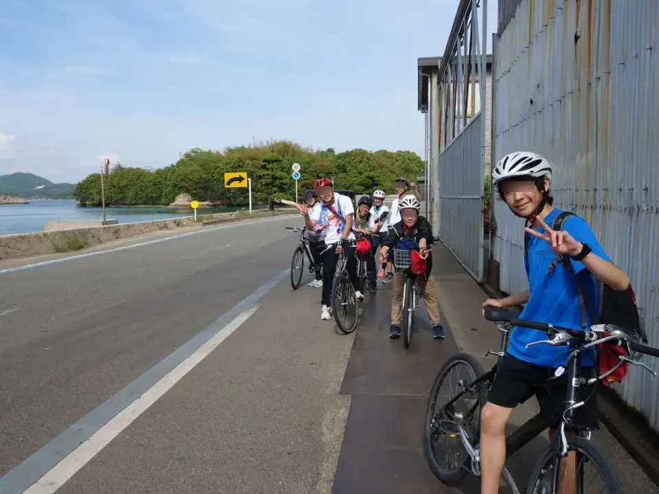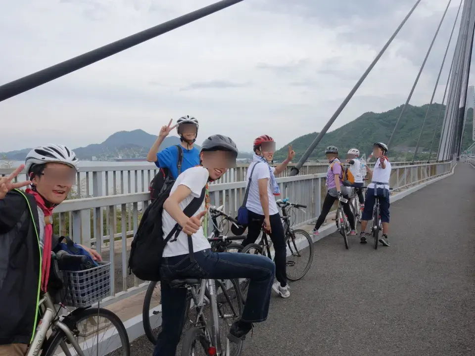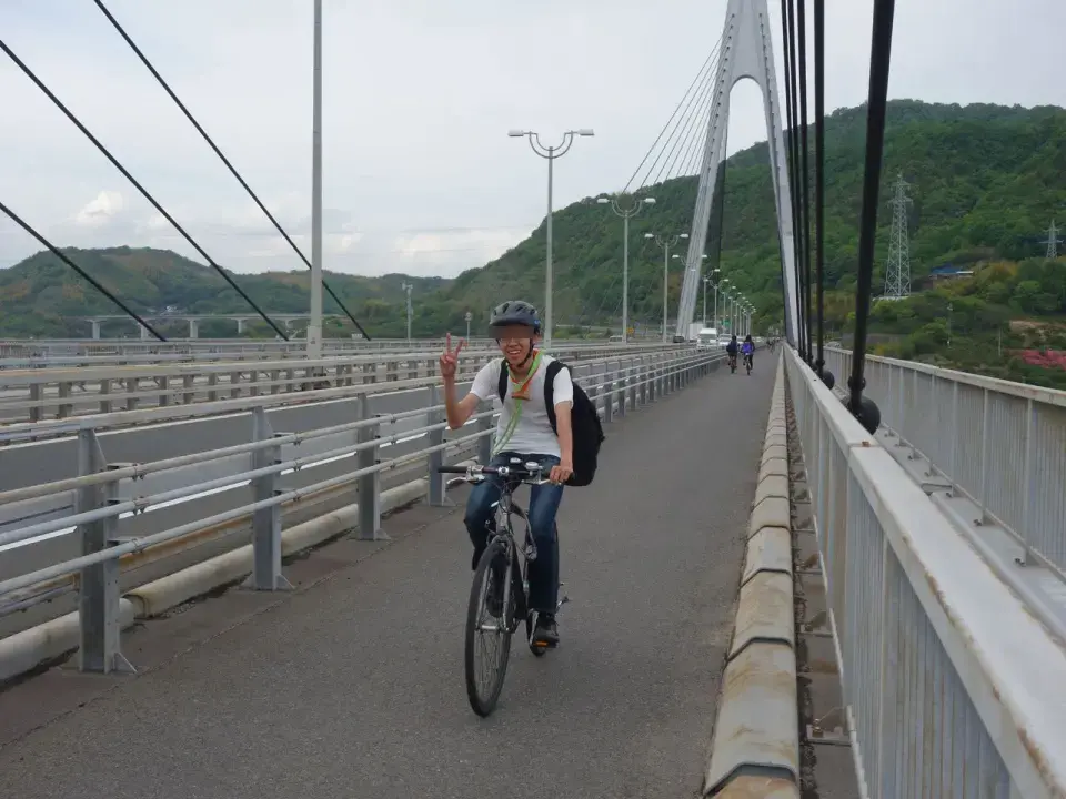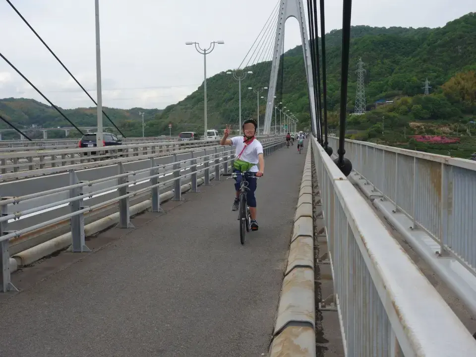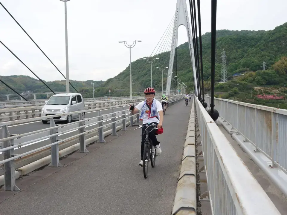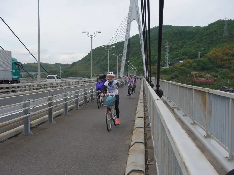 因島大橋をバックに記念撮影。スカウト達は遮二無二に自転車を漕ぐ。あまりにもったいない。