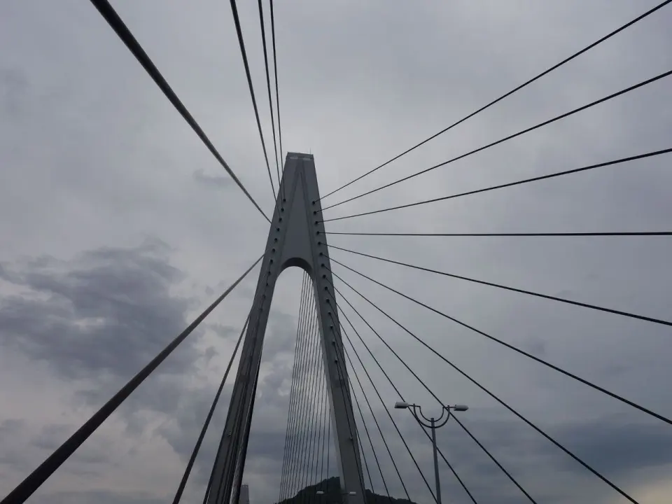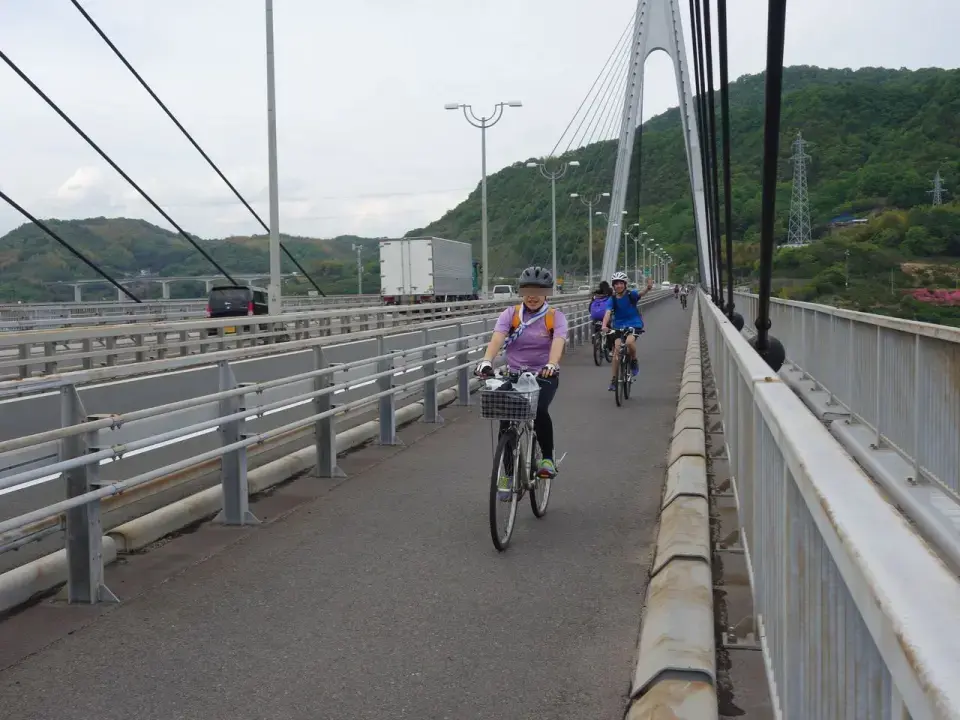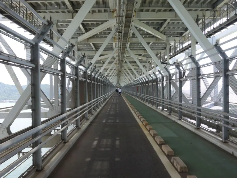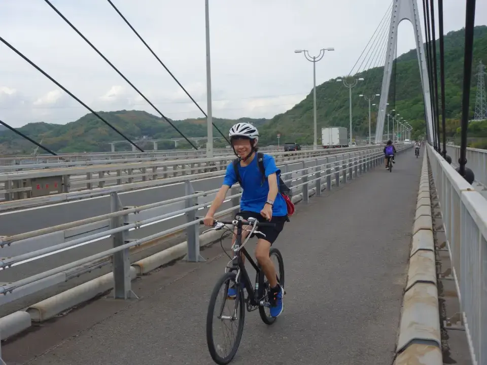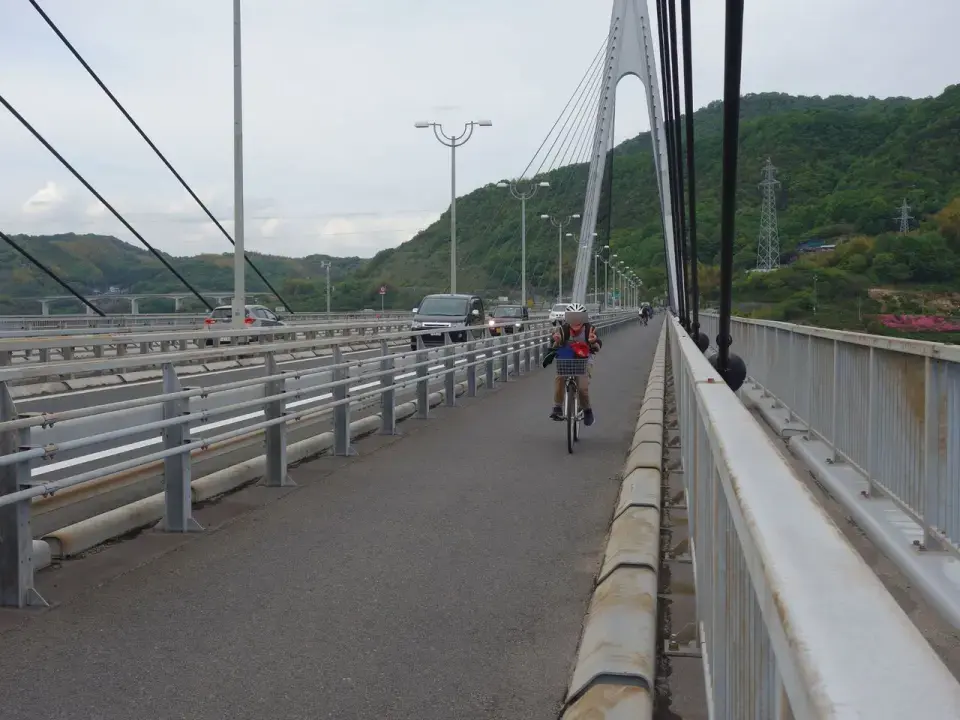 サイクリングコースから橋の上までは急坂を登る。これがけっこうキツイ。最初に渡る因島大橋は、橋の下を走る。歩行者も徒歩で渡ることができる。ヒンヤリとした空気を顔に受けながら快走する。