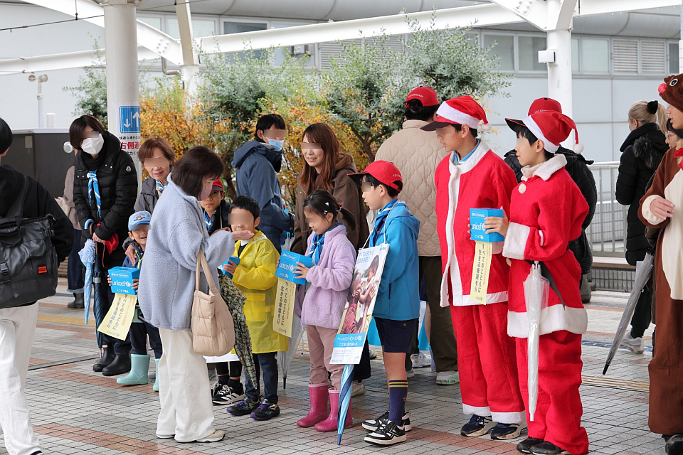 そして圧巻だったのが、ボーイ隊とベンチャー隊!なんとサンタクロースとトナカイの着ぐるみで登場しちゃったんです!小雨の中、モコモコの着ぐるみ…めっちゃ暑そう(絶対暑いよね)って心配になったんですけど、彼らは「インスタ映えするっしょ!」ってノリノリ。確かに、雨の千里中央に突然現れたサンタ軍団、めちゃくちゃ目立ってました(笑)。道行く人も二度見してました。