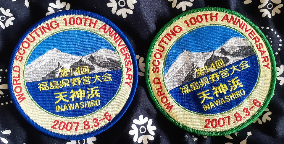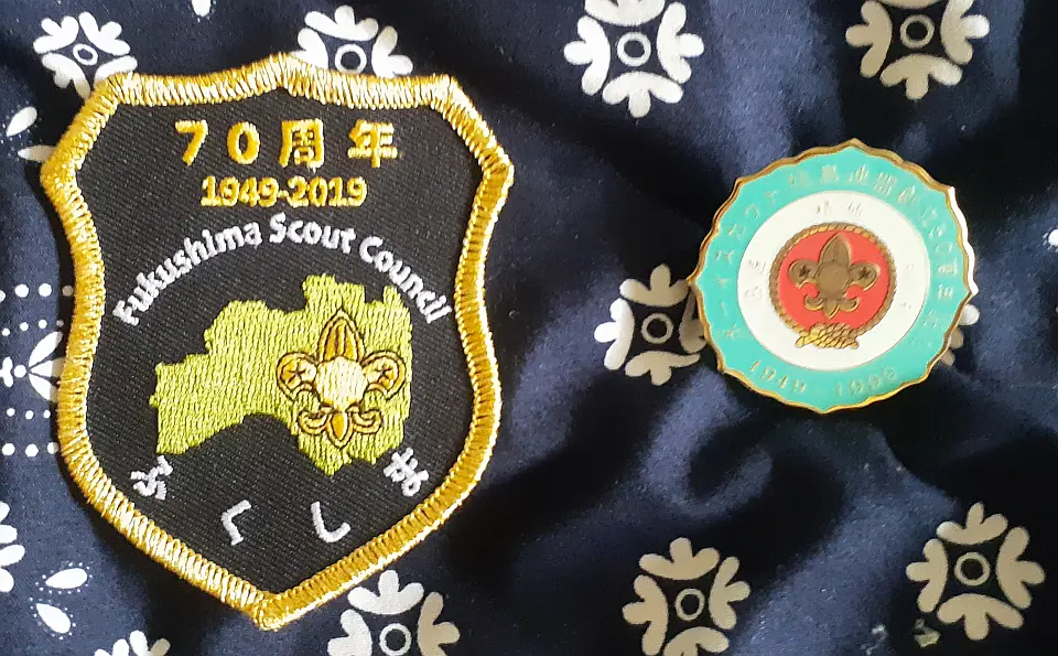 【ネッカチーフ】福島連盟 ネッカチーフ 2023.10.032025.09.01 福島第5団 当団は昨年、創設50周年を迎えました。草創期に初代の副長のデザインしたネッカチーフを、愛着を込めて現在も着用しています。中央の星は北を指す北極星を、中央のAは秀峰吾妻山のAと、A級(最高峰のスカウトを目指す)のAを形取っています。50年前のデザインとしてはとても斬新なデザインだったのでしょう。団事務局 大関さん所有 会津若松第2団 団は母体が浄土真宗本願寺派のお寺です。小金井4団 奈良英宏 氏 所有 猪苗代第1団 小金井4団 奈良英宏 氏 所有 相馬第1団 当時団委員長をされていた吉田重成様が考案されたものをベースに作成。色は、中間色である水色でこれは「中庸」の考えに基づいています。2頭のペガサスは、相馬は馬の里であり、馬陵ボーイスカウトの名を使っているのでペガサスをフェルトの基地を形に切り抜いています。 小金井4団 奈良英宏 氏 所有 会津若松第1団 小金井4団 奈良英宏 氏 所有 白河第1団 小金井4団 奈良英宏 氏 所有 矢吹第1団 矢吹町は宮内庁管轄の御料場があったように矢吹ヶ原という原野が多く、町鳥が雉(きじ)のため雉をデザインしています。福島66団から矢吹第1団に名称変更。小金井4団 奈良英宏 氏 所有 須賀川第1団 図案は須賀川市の花ボタンを配しています。小金井4団 奈良英宏 氏 所有 二本松第1団 発団当時は、福島第58団。自然に親しむということから緑一色に白の縁取りをしただけのあっさりしたシンプルなチーフです。スカウトはそれぞれネッカチーフの後ろに記念ワッペンをつけたりしています。小金井4団 奈良英宏 氏 所有 福島第1団 小金井4団 奈良英宏 氏 所有 福島第2団 小金井4団 奈良英宏 氏 所有 いわき第3団 小金井4団 奈良英宏 氏 所有 桑折第1団 桑折(こおり)と読みます。デザインは以前からの黄緑を基調に赤の縁取り、桑折町のシンボルである半田山(すり鉢を半分に割ったような形)の真ん中のくぼんだところには山頂から見るとハート型に見える羽田沼と特産部でである桃の形をかけています。ネッカチーフの真ん中にはBepreparedと入れてあります。小金井4団 奈良英宏 氏 所有 福島県連盟章 会津磐梯山と猪苗代湖、輝く北極星を背景に、中央に福島県章を配置し、中にスカウト章を組み入れたことで福島連盟を強調しました。小金井4団 奈良英宏 氏 所有 福島連盟創立記念 福島連盟創立50周年リングと70周年記念ワッペンです。小金井4団 奈良英宏 氏 所有 第14回福島県野営大会記念ワッペン 第14回福島県野営大会記念ワッペンです。枠色が違います。小金井4団 奈良英宏 氏 所有 第5回北海道、東北ブロック野営大会 第5回北海道、東北ブロック野営大会のワッペンです。小金井4団 奈良英宏 氏 所有