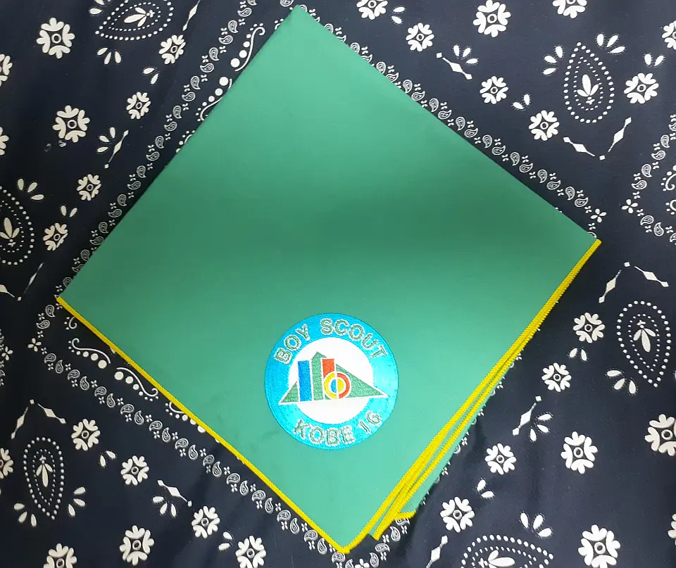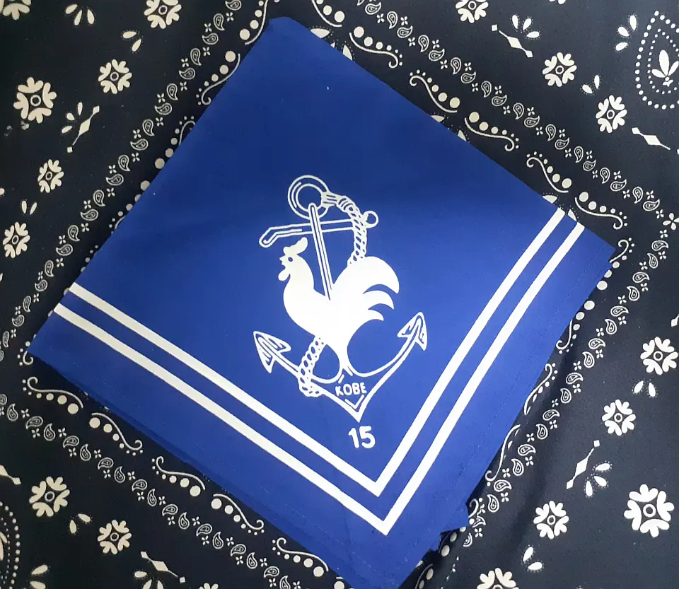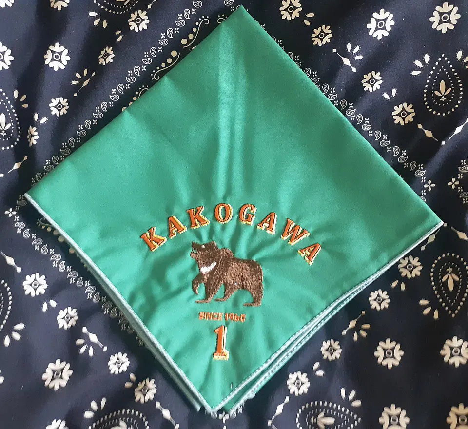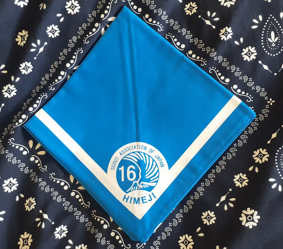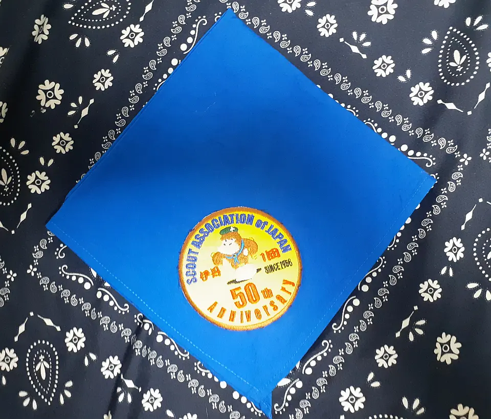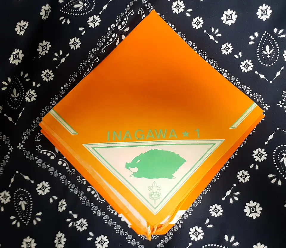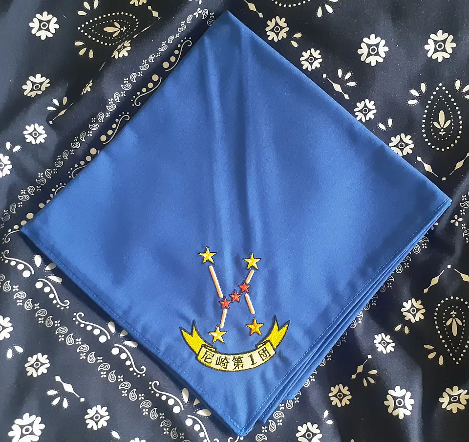 当団の『Simple is Best!』のネッカチーフです。地味ですが着用すると縁取りが螺旋状になるという面と紺を基調としているネッカチーフが意外と少ない面から、地区行事などでは 結構目立ったりします。カブ隊隊長 富永さん