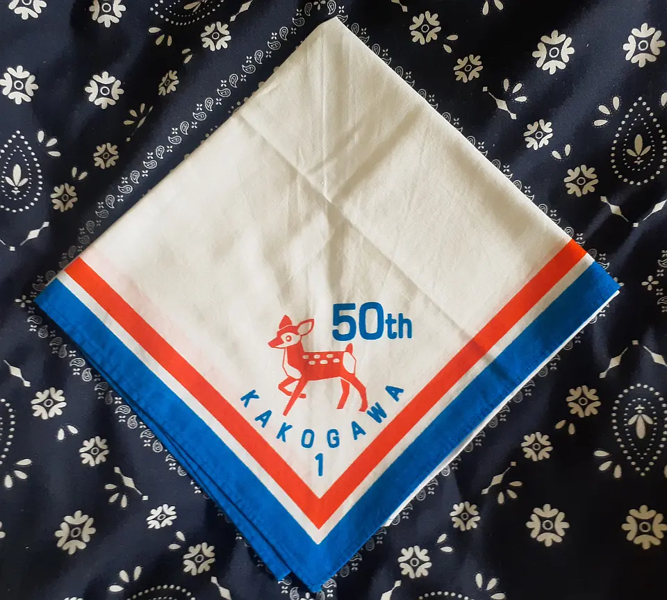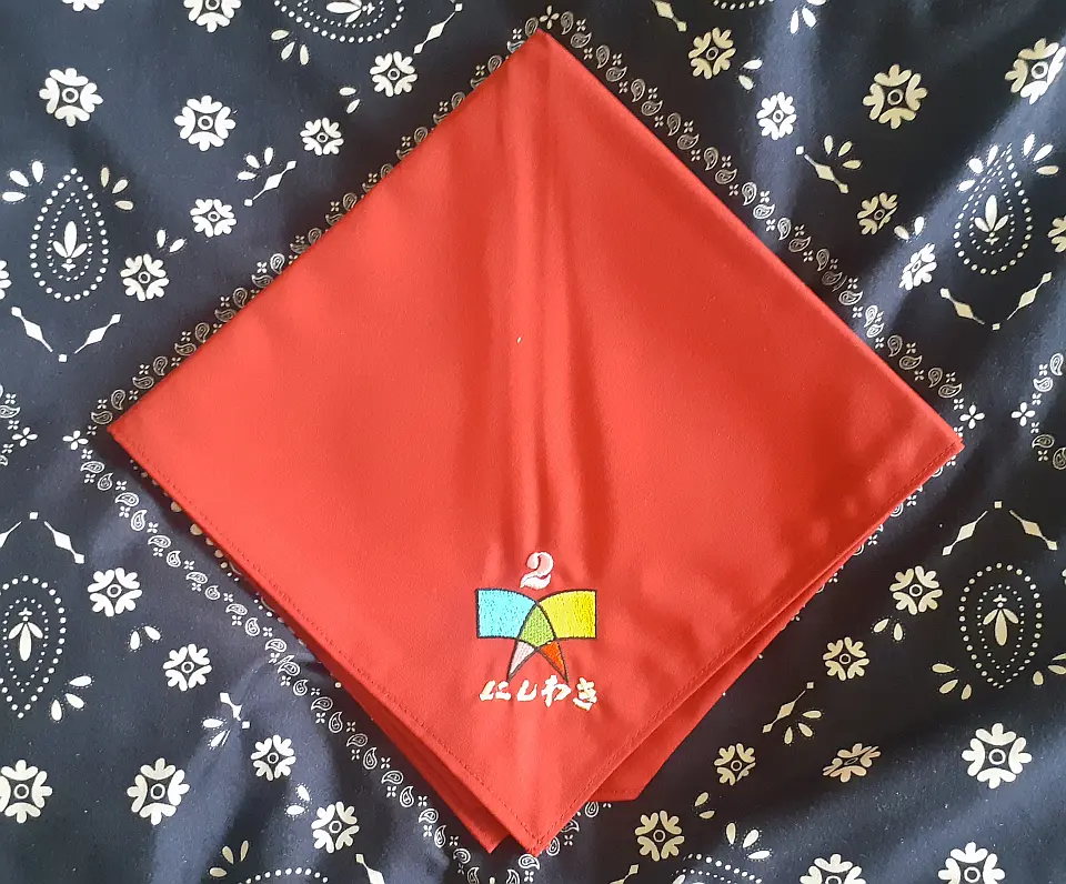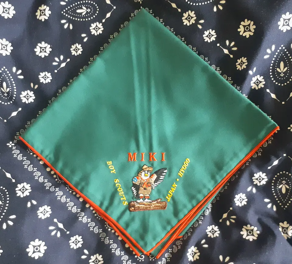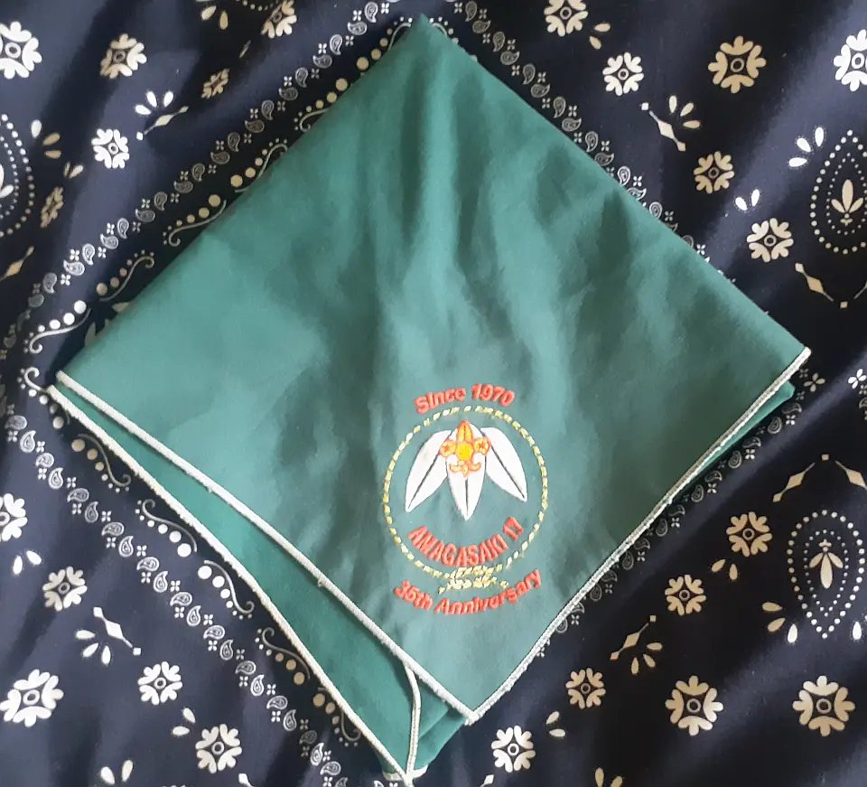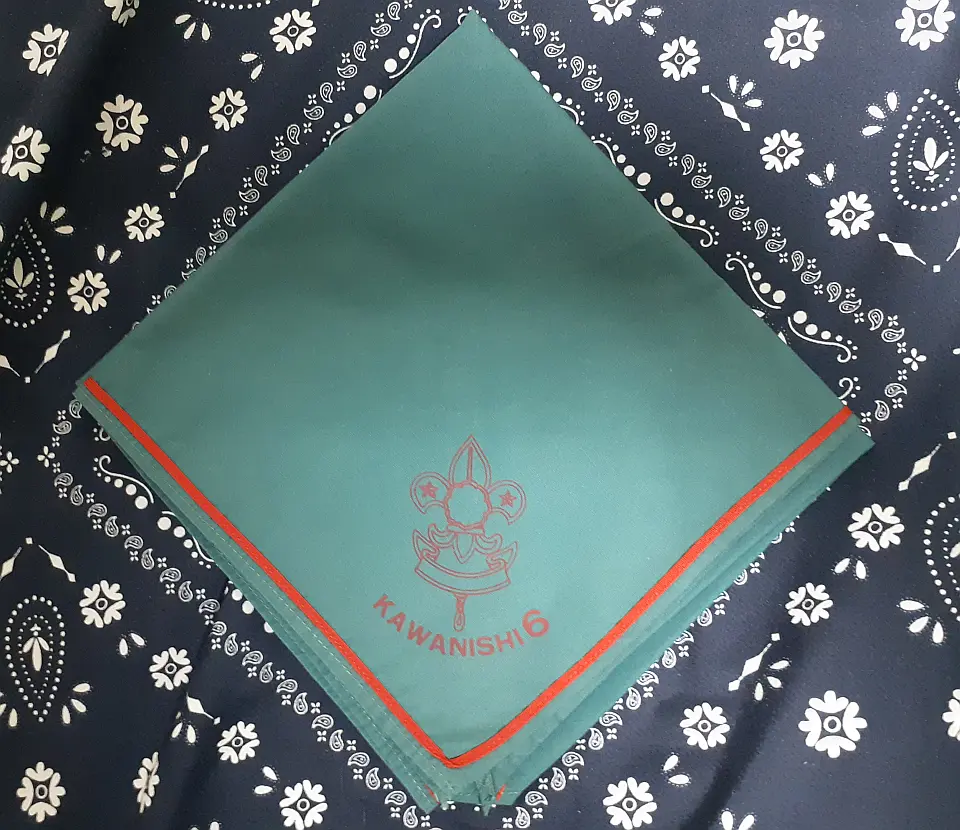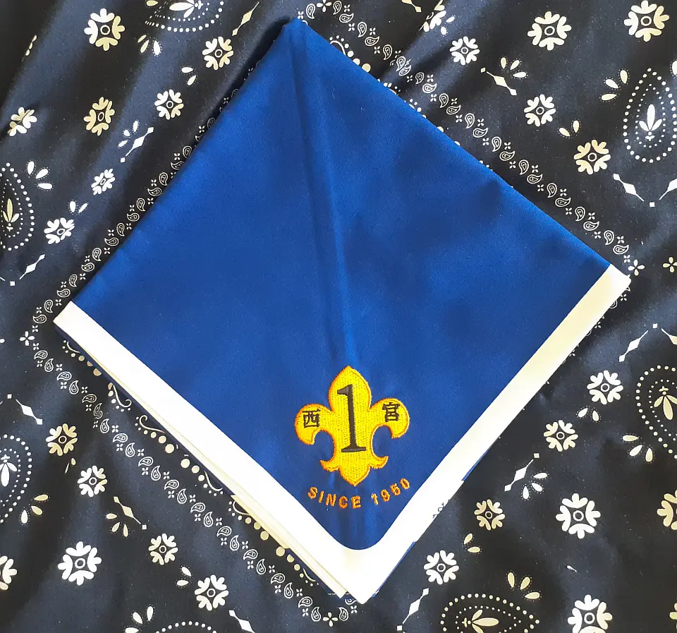 当団の『Simple is Best!』のネッカチーフです。地味ですが着用すると縁取りが螺旋状になるという面と紺を基調としているネッカチーフが意外と少ない面から、地区行事などでは 結構目立ったりします。カブ隊隊長 富永さん