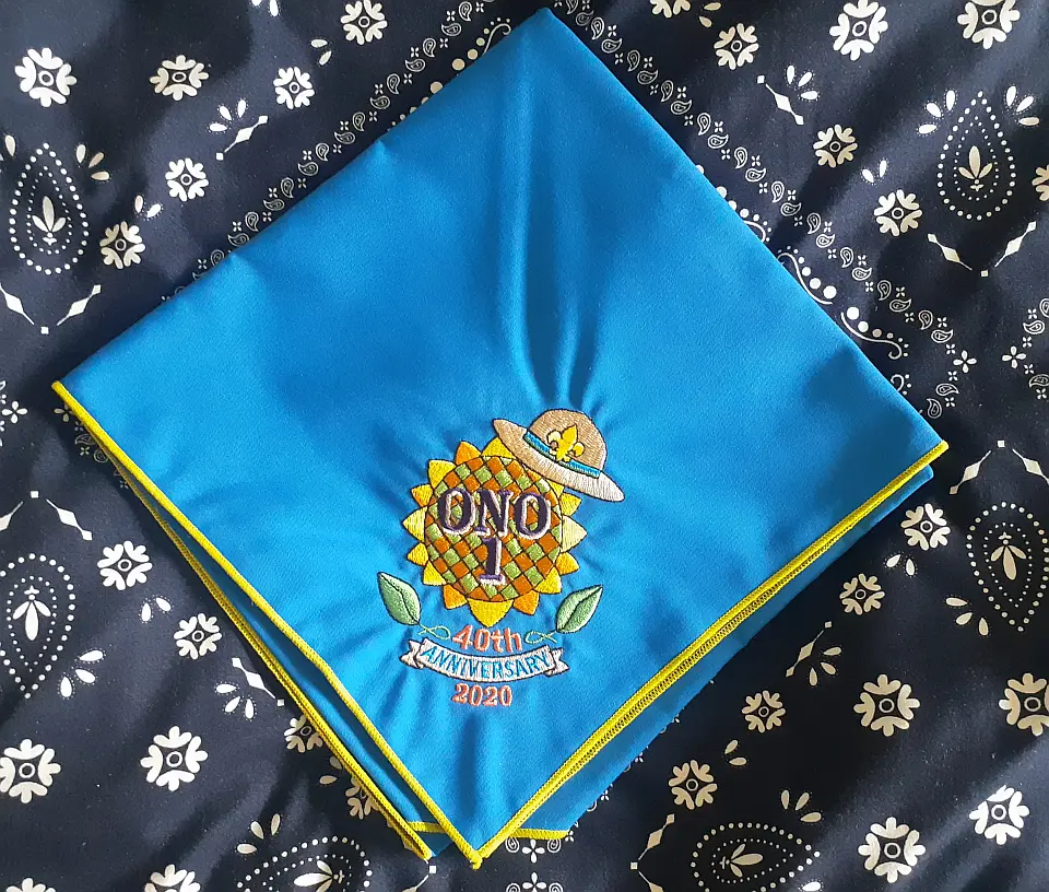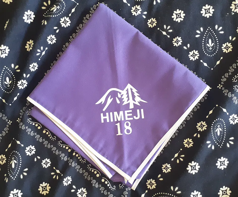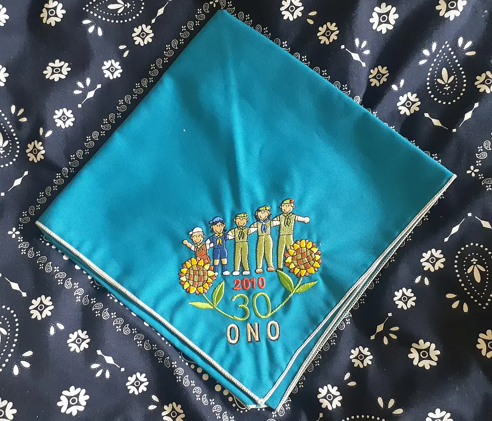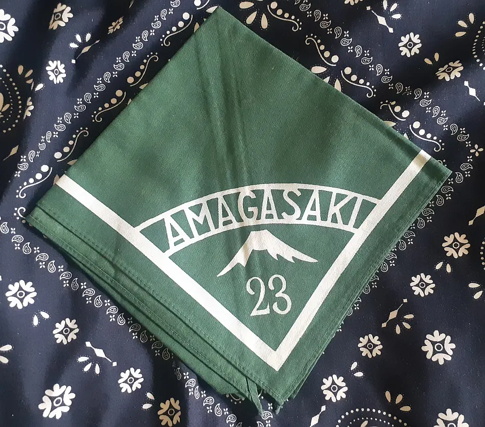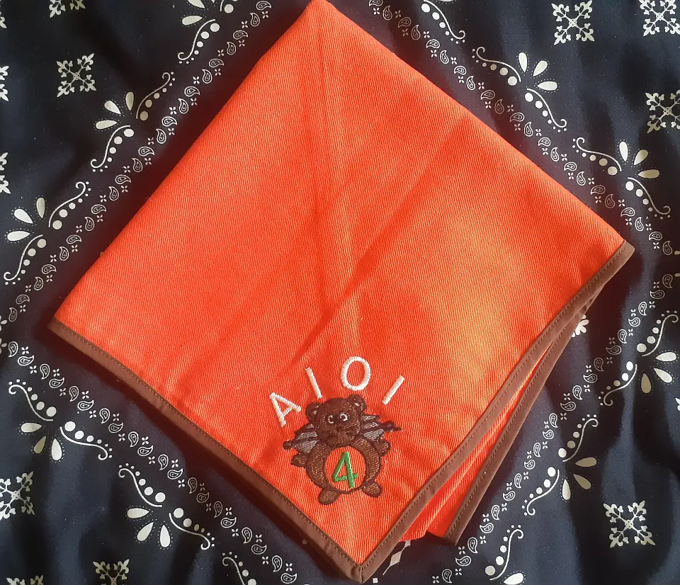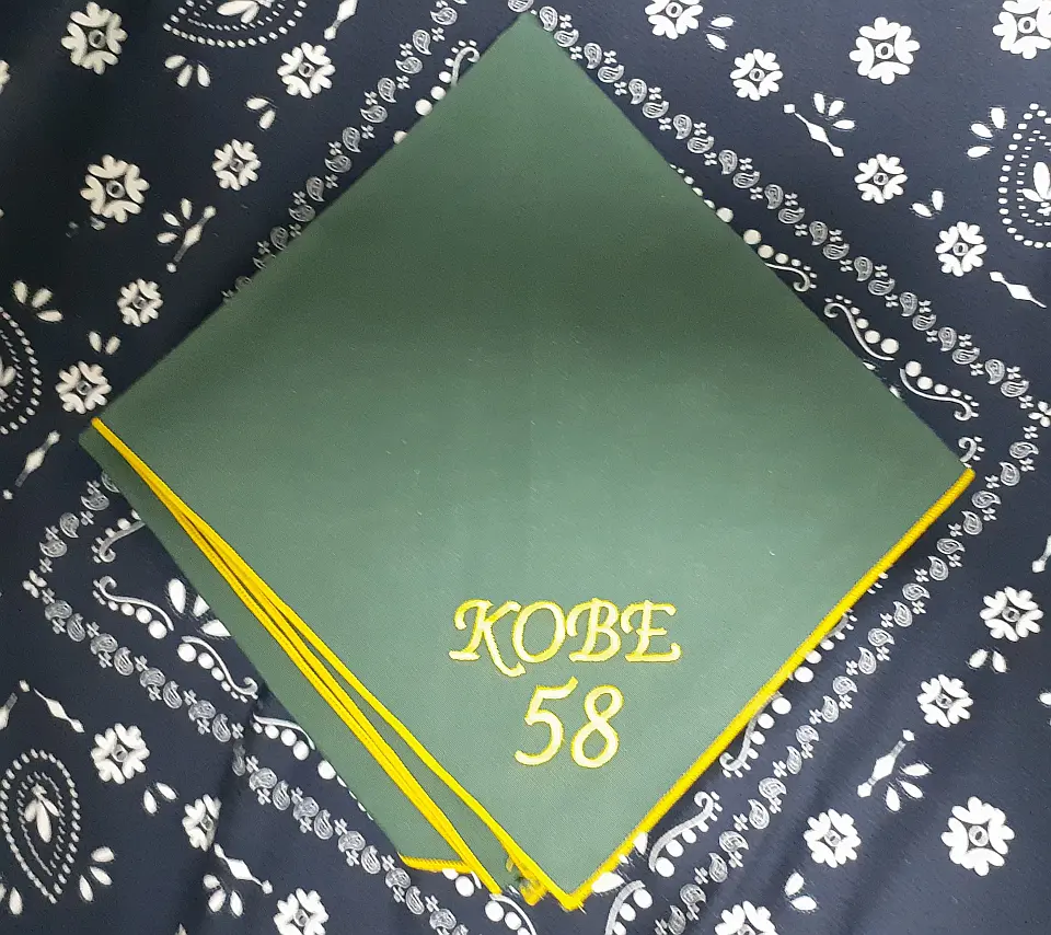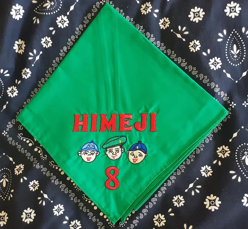 当団の『Simple is Best!』のネッカチーフです。地味ですが着用すると縁取りが螺旋状になるという面と紺を基調としているネッカチーフが意外と少ない面から、地区行事などでは 結構目立ったりします。カブ隊隊長 富永さん