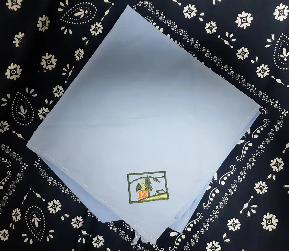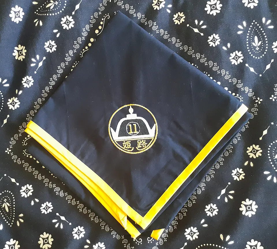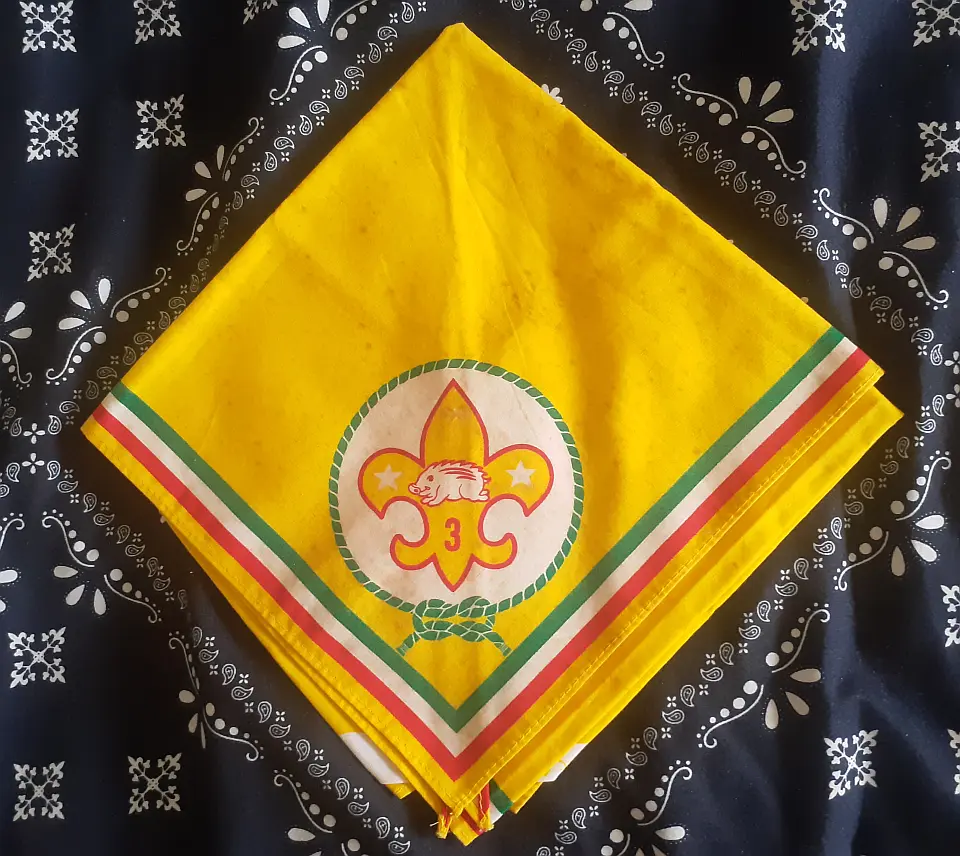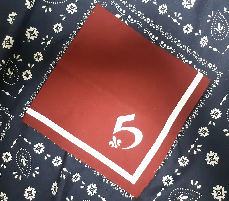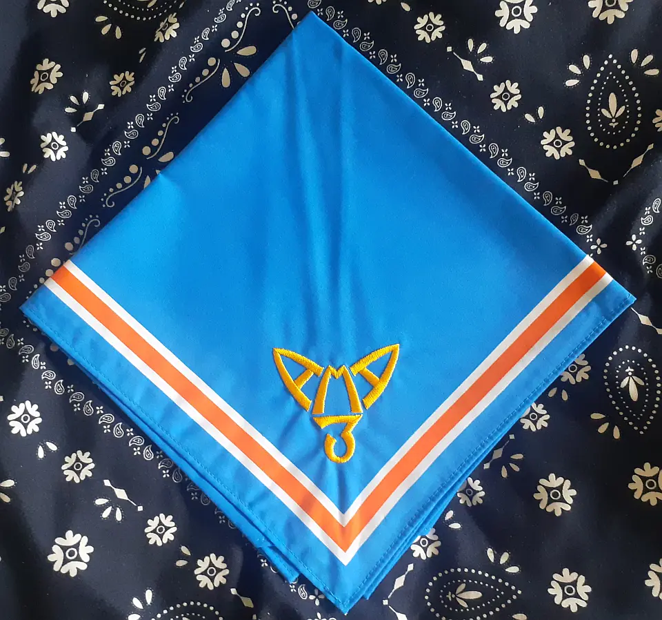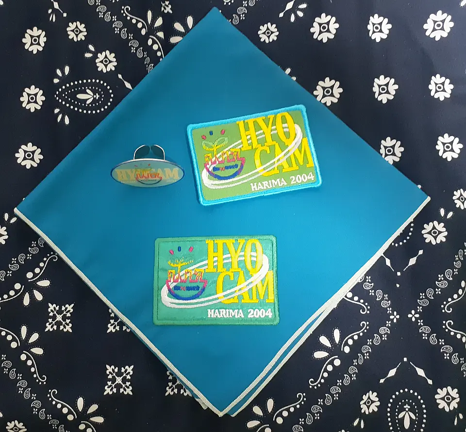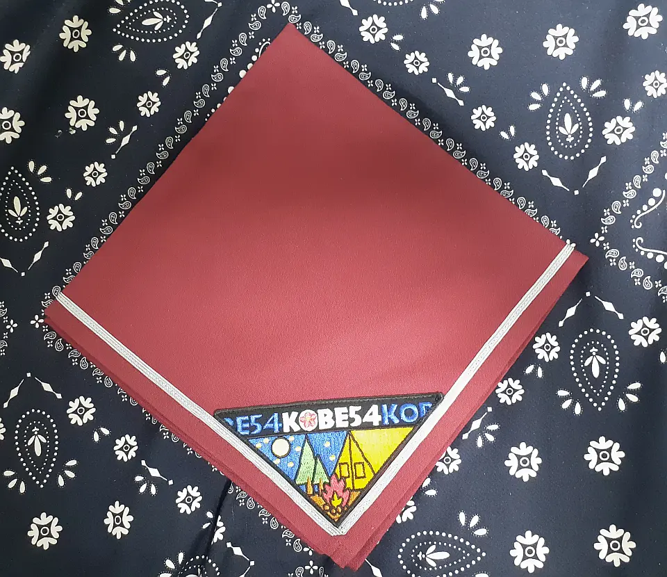 当団の『Simple is Best!』のネッカチーフです。地味ですが着用すると縁取りが螺旋状になるという面と紺を基調としているネッカチーフが意外と少ない面から、地区行事などでは 結構目立ったりします。カブ隊隊長 富永さん