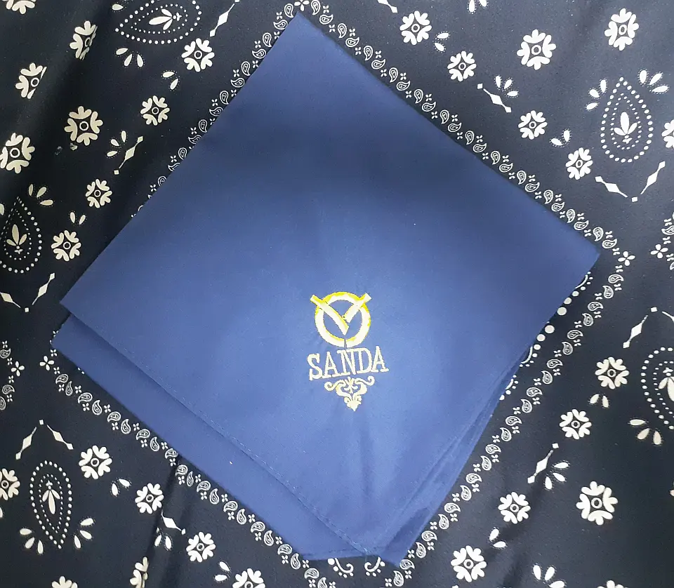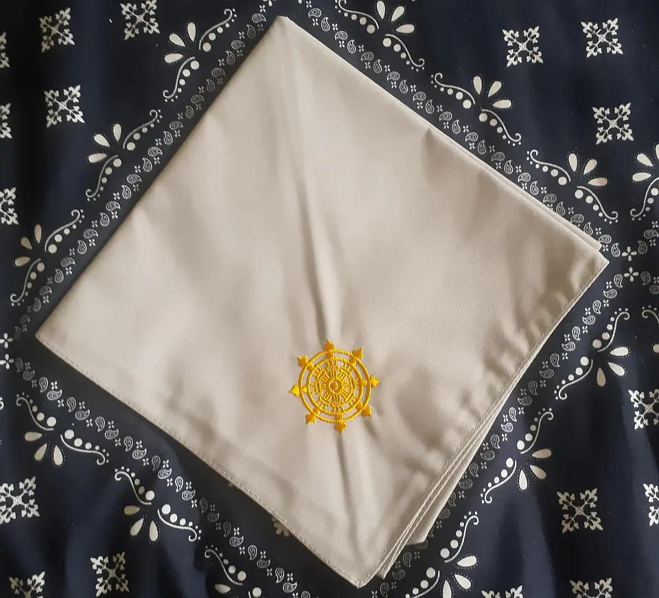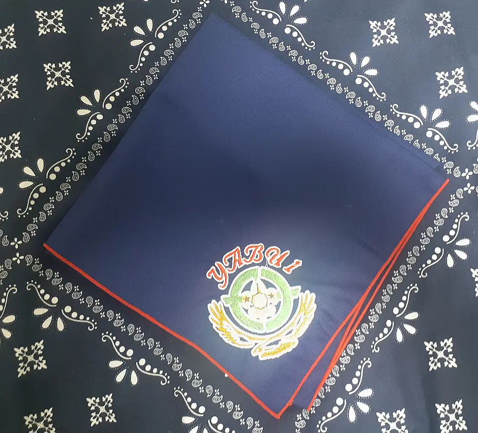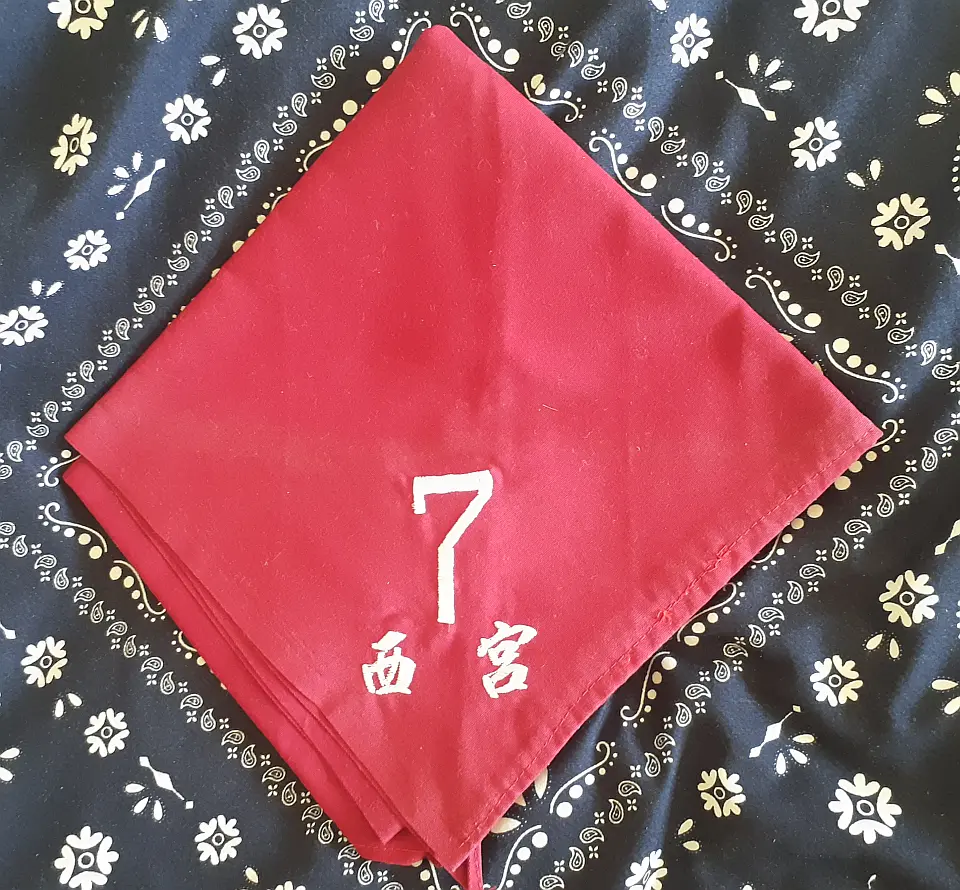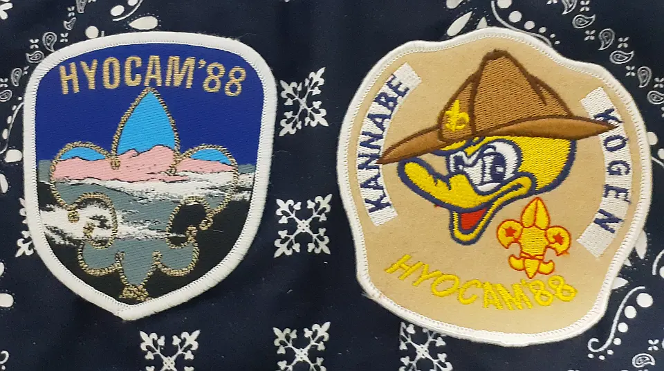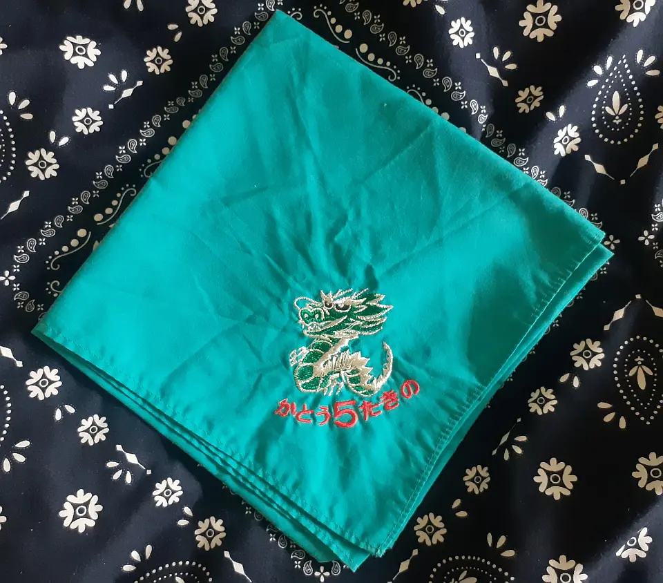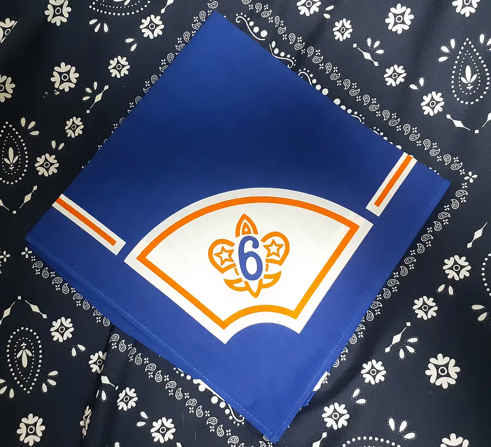 当団の『Simple is Best!』のネッカチーフです。地味ですが着用すると縁取りが螺旋状になるという面と紺を基調としているネッカチーフが意外と少ない面から、地区行事などでは 結構目立ったりします。カブ隊隊長 富永さん