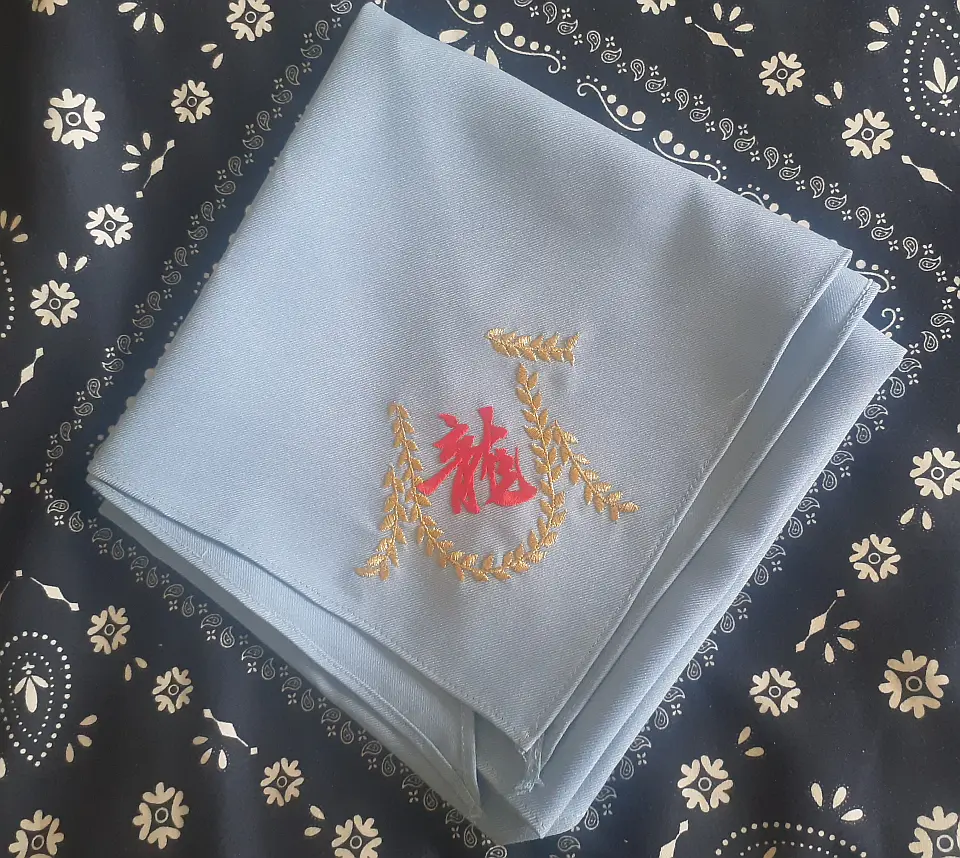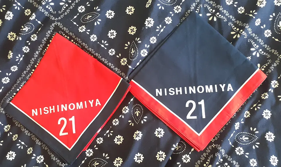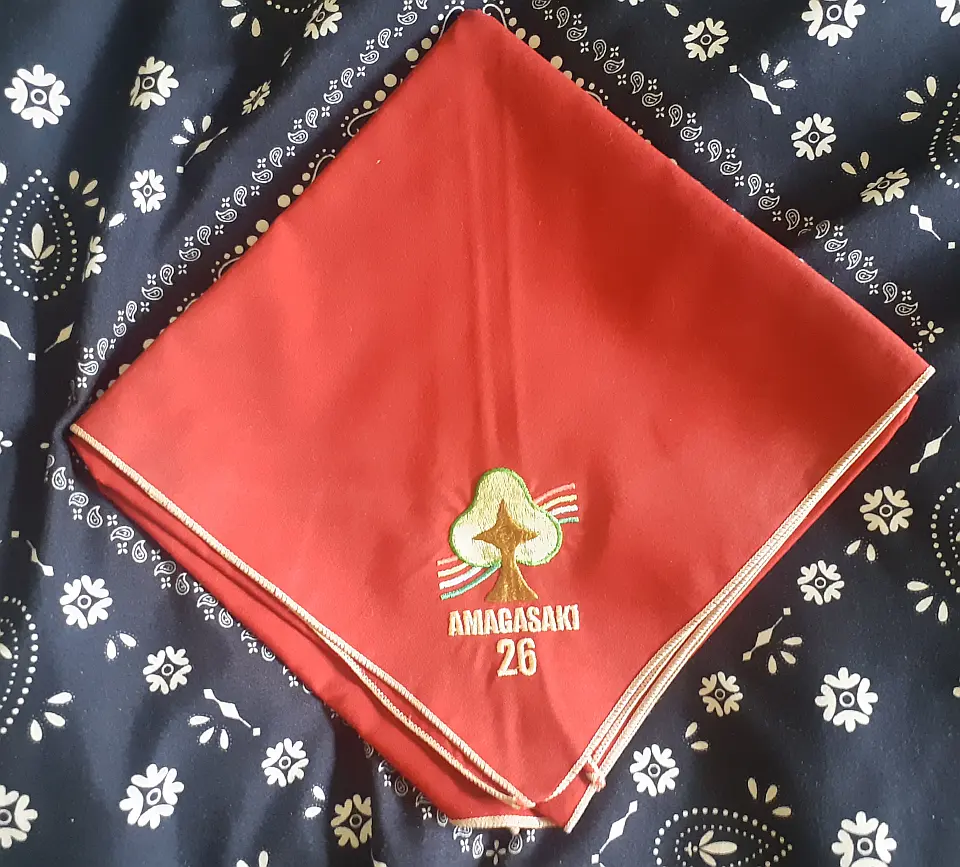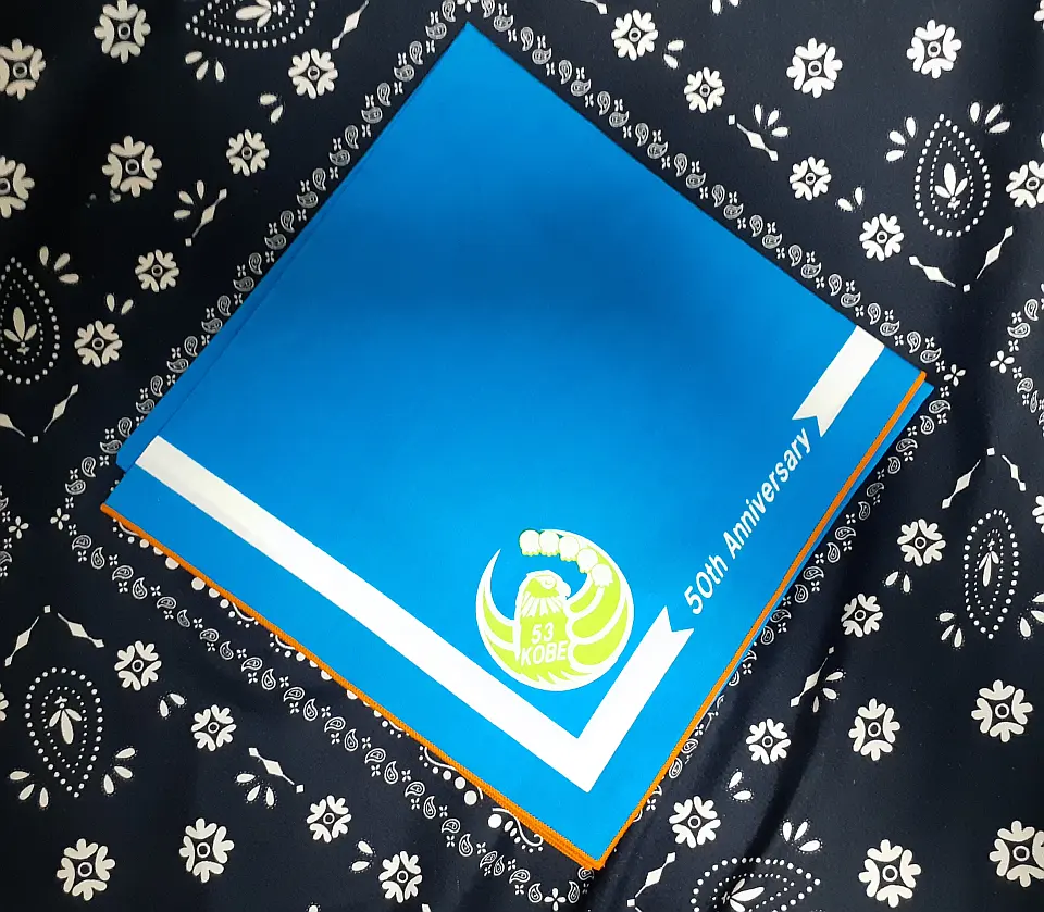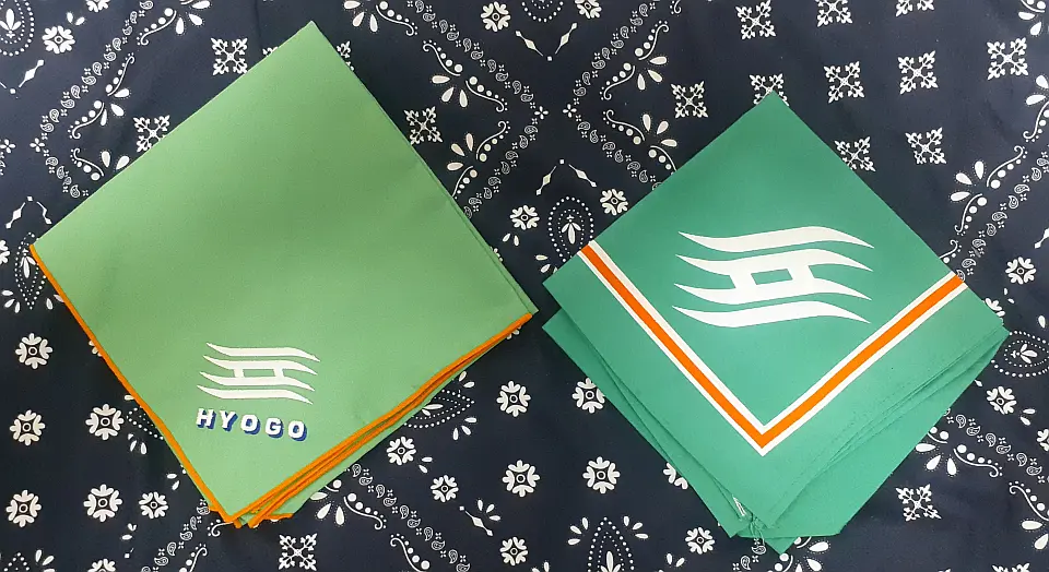 兵庫連盟ネッカチーフです。白い「兵」の特殊字体の兵庫県マークを活用して作成したチーフです。