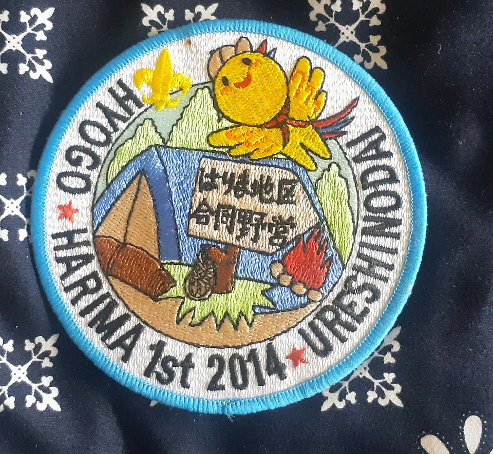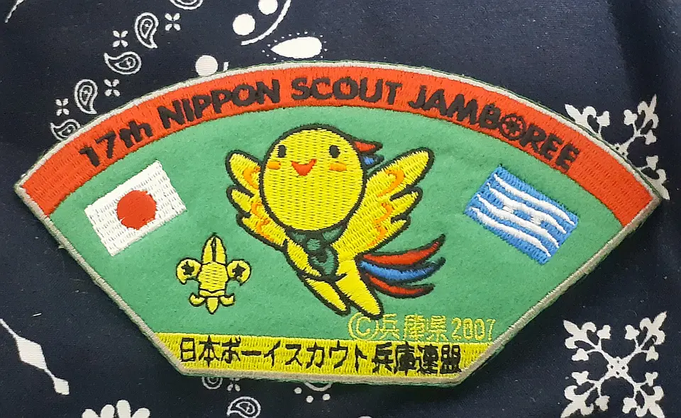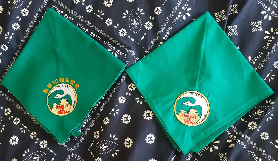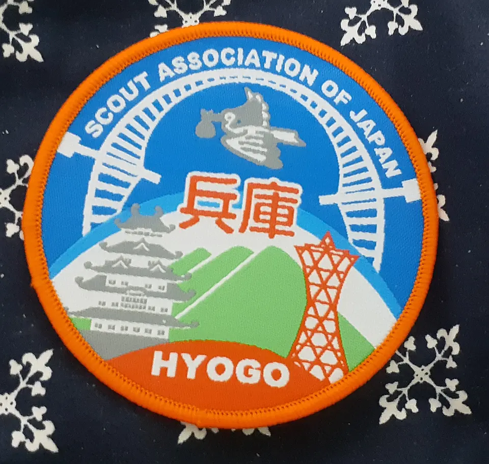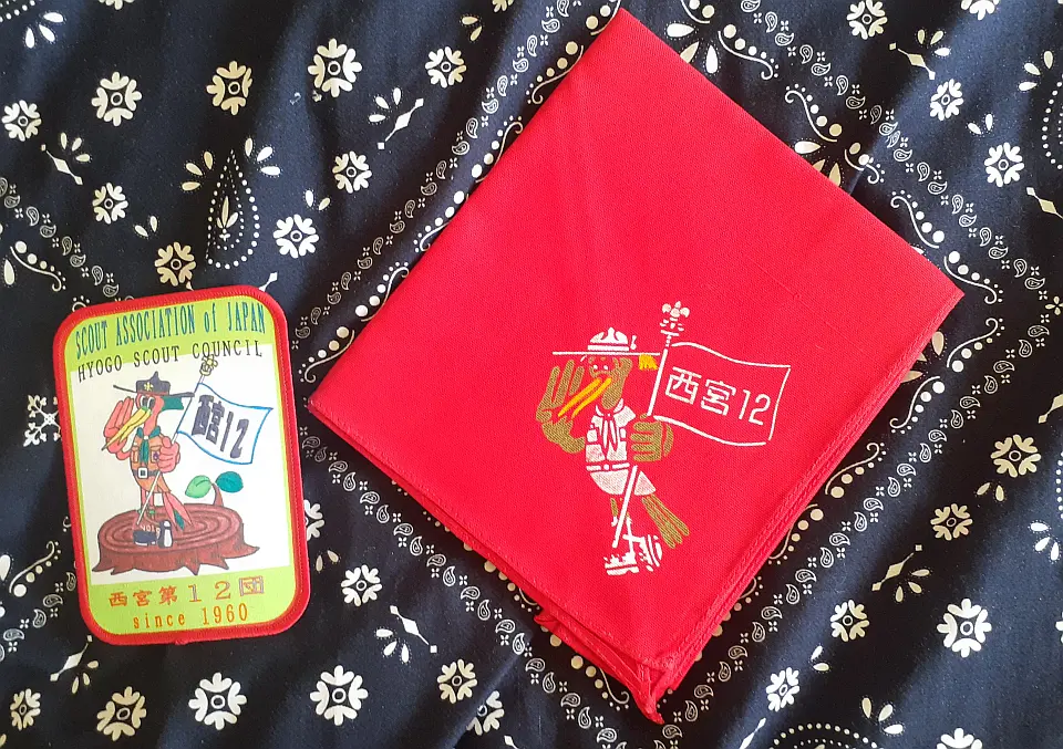 豊岡第2団のチーフです。図柄の鳥は国の特別天然記念物のコウノトリを表し、兵庫の県鳥でもあるコウノトリの日本最後の生息地、豊岡市にある「兵庫県コウノトリの郷公園」で野生に復帰させる試みと保護や増殖に取り組んでおります。小金井4団 奈良英宏 氏 所有