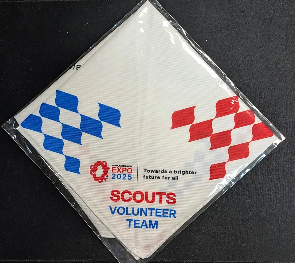 1990年に大阪で花博が開催されたときの記念チーフです。開会式のオープニングセレモニーに奉仕した人だけが手に入れた貴重なものです。あとにも、さきにもその日一日だけ使用した一回限りのネッカチーフです。