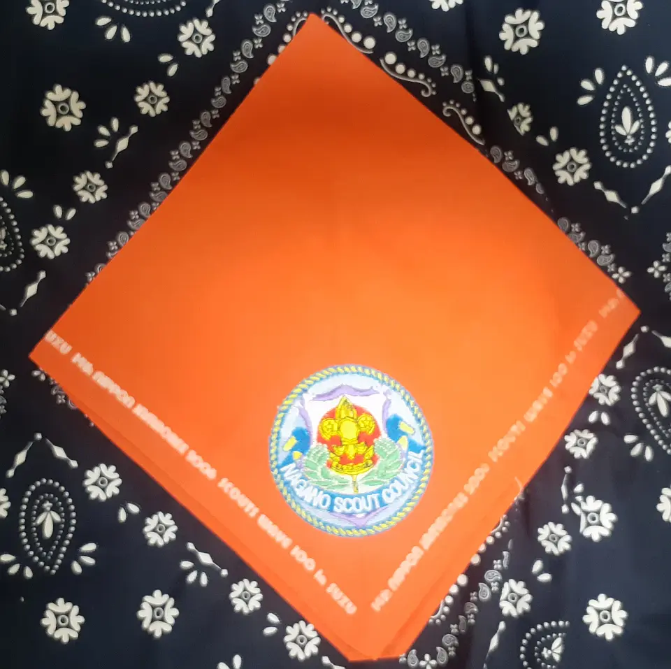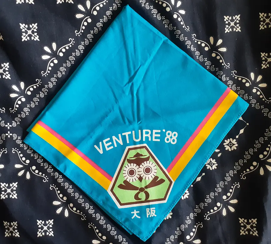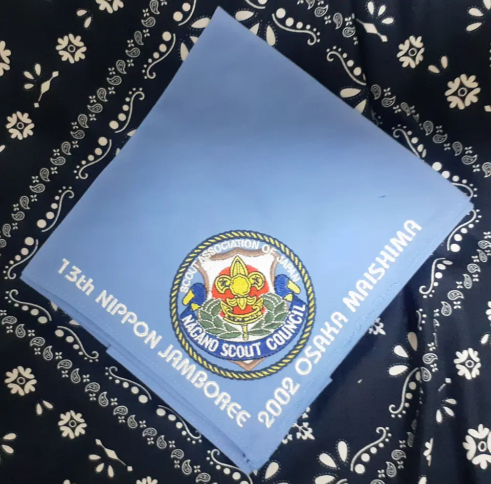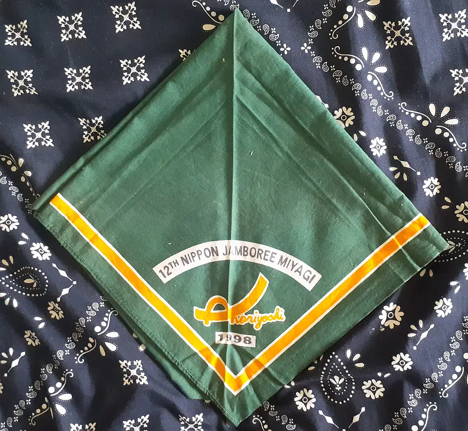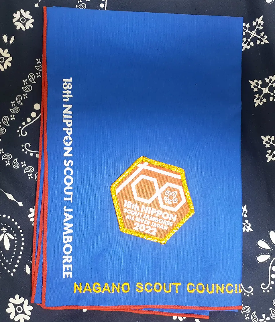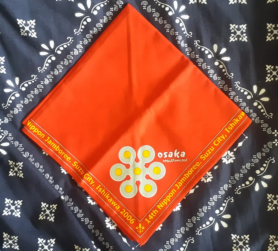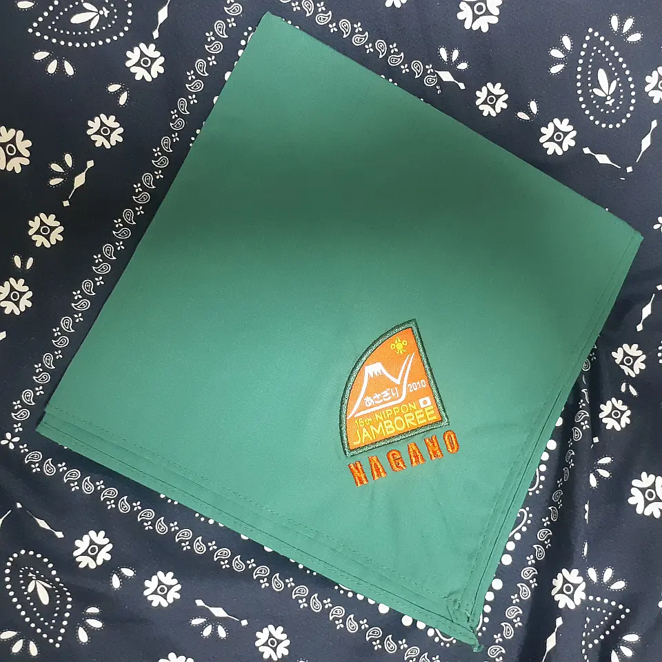 5NJネッカチーフを展開すると、長さ72CM四角形になり、ベースは13WJネッカーフと同じオレンジ色で、赤、白、紺色の縁取、上下の先端に5NJ大会マークと日本初級スカウト章で、即ち、二用のネッカチーフです。真中には、赤富士と第5回日本ジャンボリー参加記念の文字がある、非常に珍しいユニークなネッカチーフです。当時、私はSSで、同じ隊の仲間は5NJに参加した。このネッカチーフはお土産として贈られた。30年前のことですが、今までも感激しています。陳 金柱 さん 所有